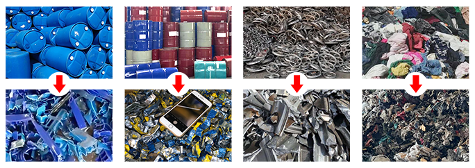 The double-axis shredder is used to crush plastics, rubber, fiber, paper, wood, large hollow materials (plastic barrels and other large containers) and various mixed wastes, especially wastes containing metal, or pre-crushed wastes containing mud and sand that are easy to wear the knife. For example: rolled film, woven bags, TV, refrigerator shell, wood, car and medium-sized car tires and hollow barrels, fishing nets, cardboard, circuit boards, etc.