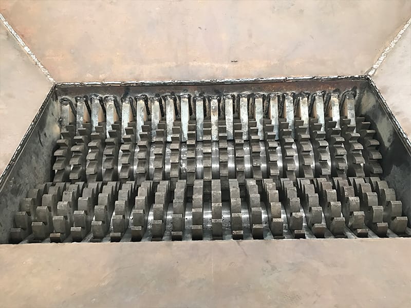 The material enters the shredding box through the feeding system. The box is equipped with shredding blades. The material is shredded into small pieces by the shredding blades, which are then discharged from the bottom of the box.