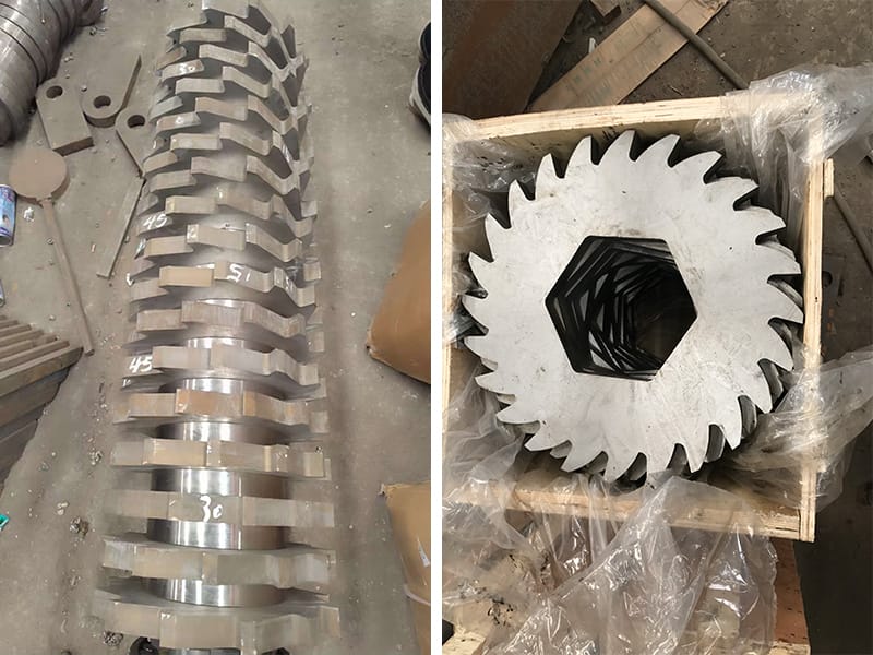 The material enters the shredding box through the feeding system. The box is equipped with shredding blades. The material is shredded into small pieces by the shredding blades, which are then discharged from the bottom of the box.